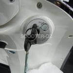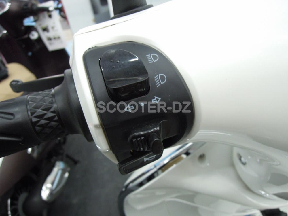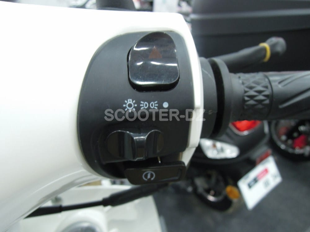 Ce scooter est équipé de feux de détresse. Au niveau du tablier, on retrouve un accroche sac et une boite à gants fermant à clefs. Son plancher est quasi plat.