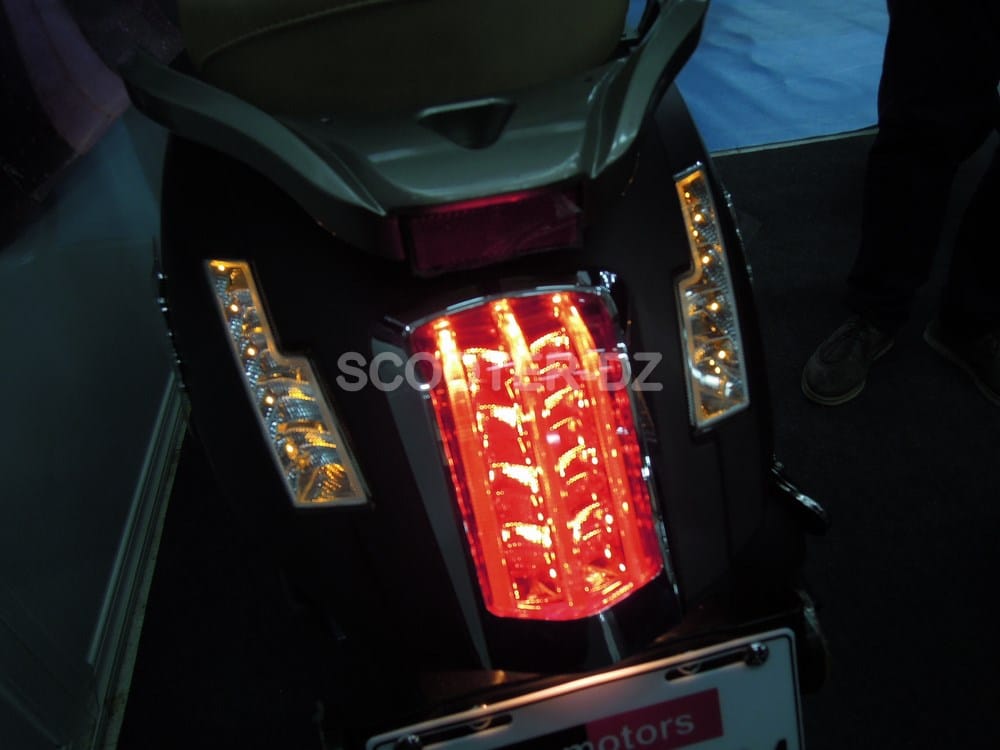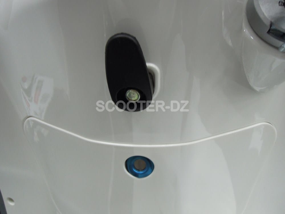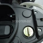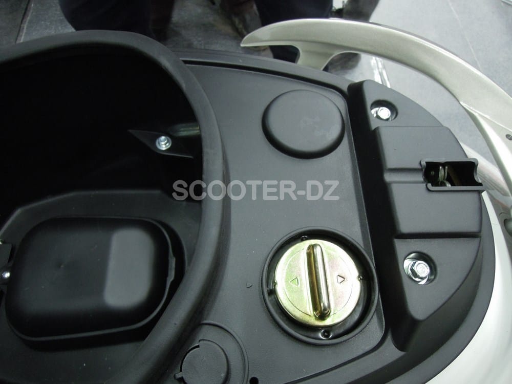 On retrouve aussi un repose paquet à l’arrière et des reposes-pieds passager retractables. Sous la selle, c’est un réservoir de 5 litres qui garanti l’autonomie de ce scooter et on peut y loger un casque jet.