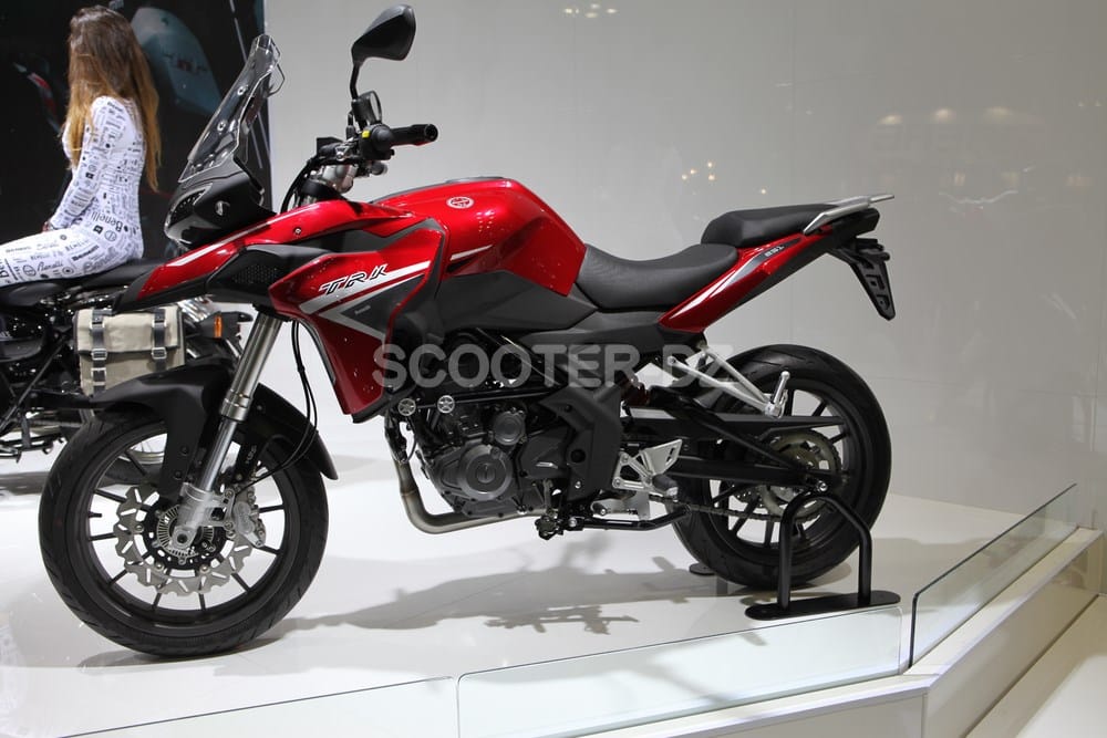 Sur le stand, notre attention s’est portée sur la Benelli TRK 250, modèle doté d’un moteur mono-cylindre de 249 cm3 développant 26 cv et couplé à une boite à 6 rapports. Montée sur des jantes de 17 pouces, cette TRK 250 ne pèse que 153 kg.