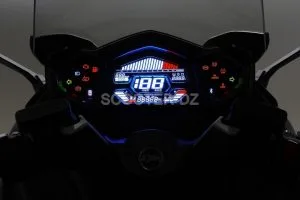 Son système de freinage est confié à un double disque de 275 mm, étrier radial à 4 pistons, pour l’avant et à un simple disque de 275 mm à l’arrière doté de l’ABS.