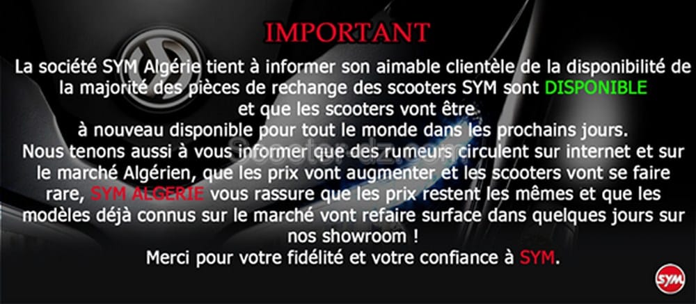Autre point important et un peu plus étonnant : SYM Algérie fait part de rumeurs et de fausses informations qui circuleraient sur les réseaux sociaux et notamment sur Facebook ainsi qu’auprès de certains distributeurs de deux roues que les prix de vente de la gamme SYM risqueraient de grimper sans justification et que l’avenir des modèles déjà commercialisés seraient remis en cause.