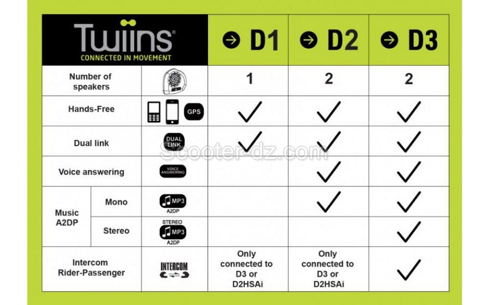 Grâce à la fonction intercom, parlez avec votre passager, écoutez votre musique préférée et répondez à vos appels tout en conduisant votre scooter ou votre moto. Le kit mains libres Twiins® D3 est compatible avec tous les téléphones portables, smartphones et dispositifs intercom. Très facile à installer, ce dispositif est conçu pour être entièrement intégré au casque.