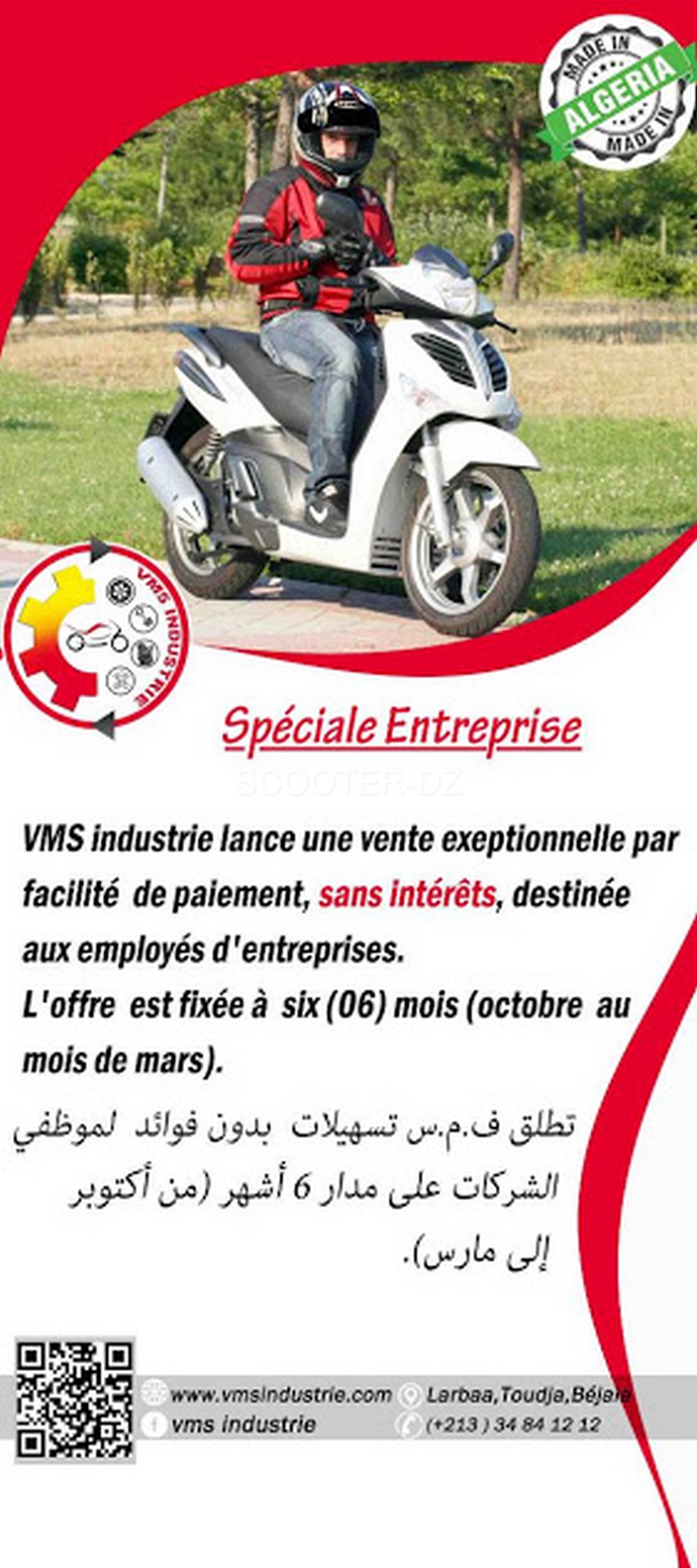 En plus de cela, VMS Industrie propose aux salariés du secteur une offre de financement sans intérêts sur une durée de 06 mois pour l’acquisition d’un des scooters VMS Joc-i 125 ou Benelli Caffe Nero 150 / Logik 150 . La période d’éligibilité de cette offre va du mois d’octobre 2018 à mars 2019.